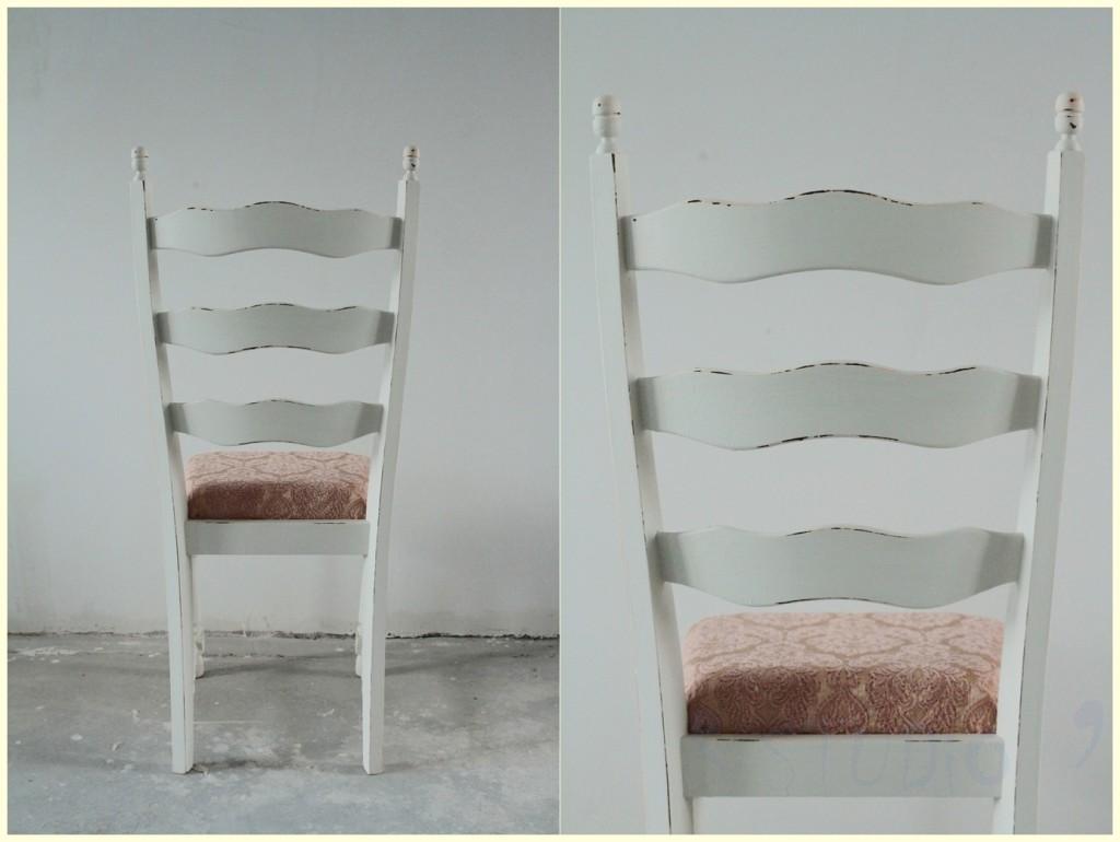 Krzesełka w pierwotnym zamyśle miały być w komplecie z kredensem (łososiowym). Utrzymane są w tej samej kolorystyce i stylu. Niestety nie posiadam zdjęć przed metamorfozą. Były bure, niechlujnie pobejcowane, z przetartym siedziskiem. Zostały całkowicie rozebrane, wyszlifowane, ponownie złożone i pomalowane. Dostały piękne, nowe, żakardowe siedziska. Tapicerka podkreśla ich romantyczny charakter.