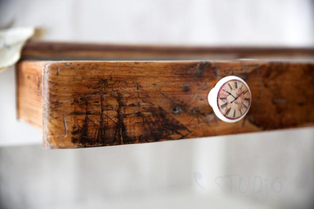 Pęknięcie na blacie zostało na życzenie nowej właścicielki, tak żeby nadać sznyt ducha czasu. Pozostawione korytarze po kornikach na szufladzie skojarzyły mi się z mapą. Zostawiłam je i wzbogaciłam kolejnymi pomysłami, które ostatecznie dały taki oto efekt finalny :-) tadaaa