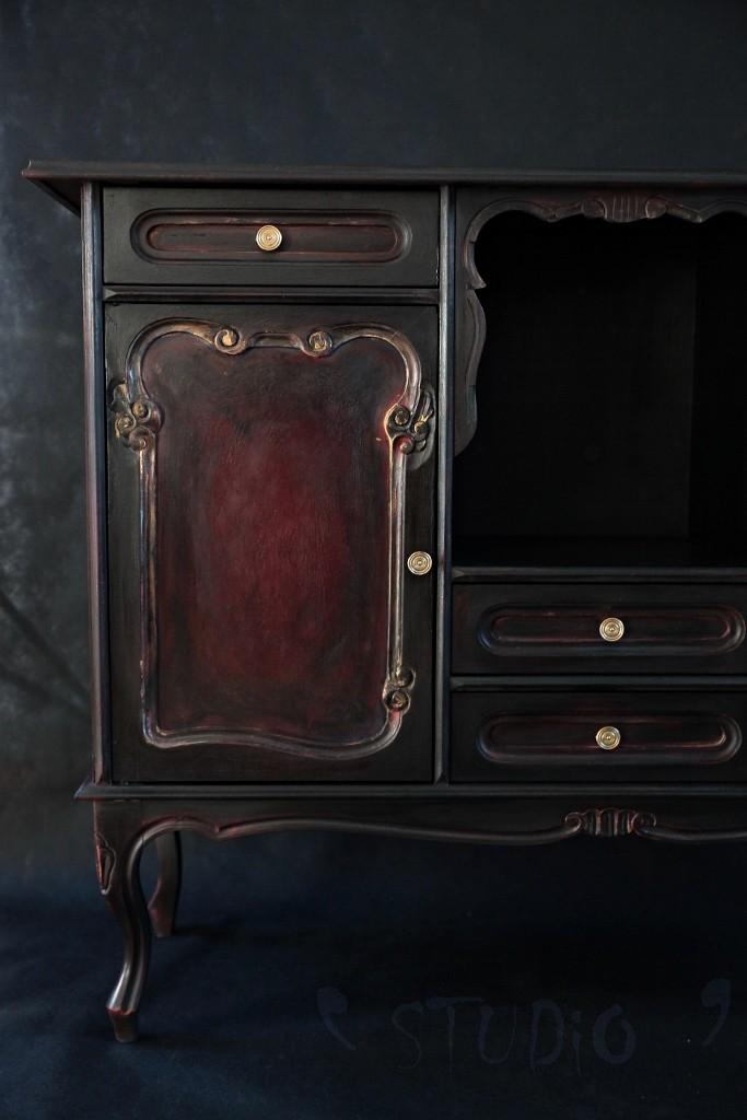 Mebel dostał ode mnie roboczą nazwę Paganini. I tak już zostało. Zainspirowany jest biograficznym filmem „Paganini: uczeń diabła”.Oglądałam ten film kilka razy. Zafascynowala mnie nie tylko muzyka Paganiniego w wykonaniu znanego wszystkim Davida Gareta, (który gra główną rolę w tym filmie), ale także dominujące kolory: czerń, granat oraz odcienie burgundu, bordo, czerwieni, złota i brązów. Czy mi się udało złapać klimat??? Farby, których użyłam to znów Nordic Chic od Metamorfoza Furniture Barbara Hansen. Te farby mówiąc kolokwialnie robią robotę!!! Czarność nad czarnościami (marność nad marnościami heh) – to przeczarny pociagnięty czarnym woskiem!!!