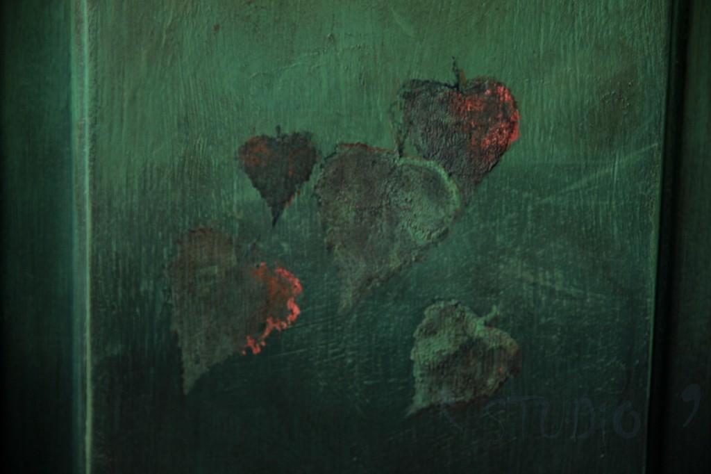 Zielona szafka, zanim zaczęła być zielona była jasnobłękitna i chyba już raz malowana. Poddana została wyjątkowemu testowi wytrzymałości. Żeby zrobić kilka ciekawszych niż zazwyczaj zdjęć postanowiłam wykorzystać niecodzienne modelki Stanęły nie tylko na wysokości zadania ale i na szfce oraz sprawiły mi wielką frajdę podczas robienia zdjęć. Odłożyłam aparat, chwyciłam za pędzel i robota poszła w ruch. Pierwszy raz robiłam takie przejście: od granatu poprzez ciemną zieleń do jasnej zieleni. Do tego malowane, lekko strukturalne liście brzozy. Malowane? Ba! Prawdziwe liście brzozy malowane, następnie odbijane na szafce i dopieszczane pędzelkiem ręcznie. Kolory liści uzyskiwałam z tych samych kolorów, którymi cieniowana była szafka. Ciemny wosk dodał efekt patyny czasu a miedziana folia oraz złoty wosk nieco blasku i elegancji. Całość prezentuje się tak