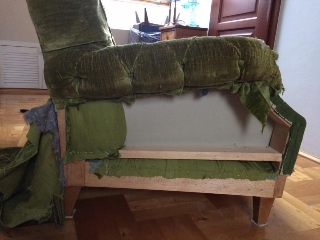 Pierwszym krokiem było rozebranie sofy na części pierwsze, zdarcie jej oliwkowego ubranka, usunięcie frędzli, dekoracji, chwostów, guzików i.t.d.