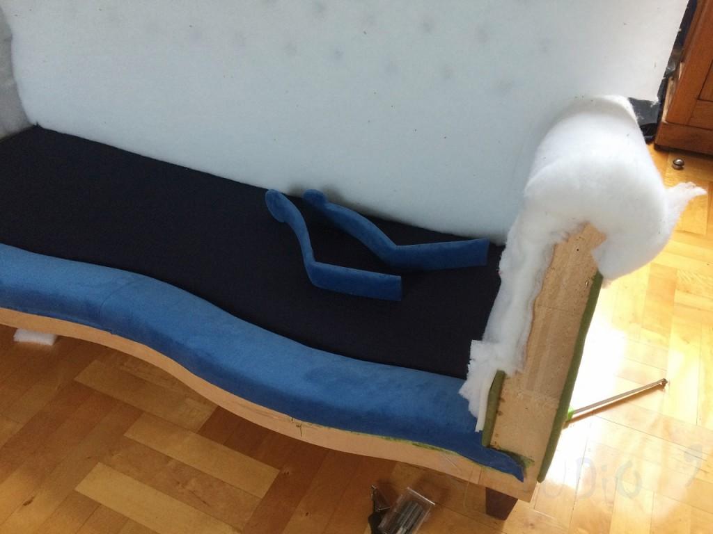 Pierwszym krokiem było rozebranie sofy na części pierwsze, zdarcie jej oliwkowego ubranka, usunięcie frędzli, dekoracji, chwostów, guzików i.t.d.